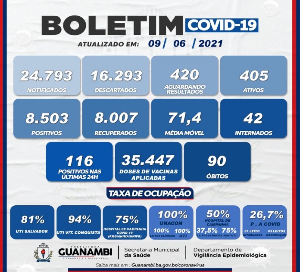 Mais três óbitos relacionados à Covid-19 foram confirmados em Guanambi nesta quarta-feira (9). As vítimas foram duas mulheres, de 70 e 90 anos, e um homem de 72 anos. Uma mulher de 42 anos, internada em hospital de referência em Salvador, também morreu. O óbito ocorreu na noite de terça-feira (8), no entanto, a Secretaria de Saúde ainda aguarda a declaração de óbito para incluí-la nos registros.