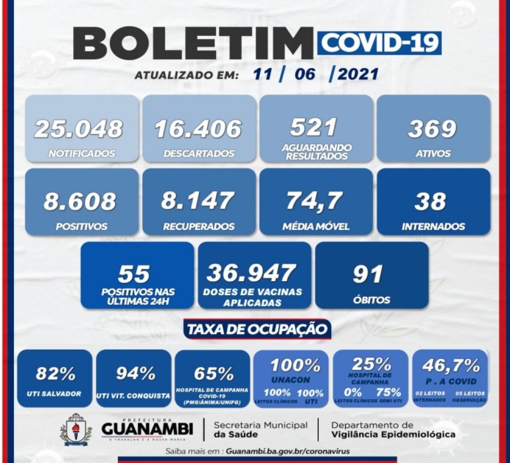 Até esta quinta-feira (11), 36.974 doses de imunizantes contra a Covid-19 foram aplicadas em Guanambi. São 25.983 pessoas que receberam pelo menos a primeira dose, o equivalente a 30,24% da população. Deste total, 10.964 pessoas (12,91%) foram vacinados também com a segunda doses.